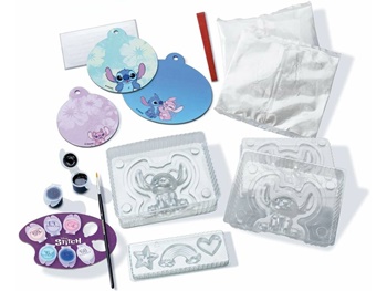 Incluye: 1 caja de almacenaje, 1 molde para la figura de Stitch, 1 molde para la figura de Ángel, 1 molde con forma de estrella, corazón y arcoíris, 1 cinta adhesiva de doble cara, 1 escayola, 1 lima, 1 pincel, 1 paleta para sujetar los botecitos de pintura, 8 pinturas acrílicas, 3 etiquetas para los elementos decorativos y 1 manual de instrucciones.