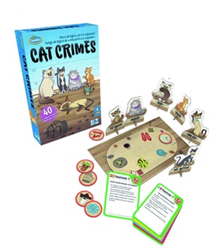 - Contiene: 1 tablero, 6 fichas de gato con pedestales, 6 fichas de crimen, 40 cartas de reto con soluciones y una guía de juego.