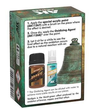 Este kit permite reproducir efectos y texturas de verdigrís en piezas y miniaturas. Indicado para modelismo y manualidades.