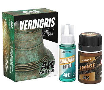 * El agente oxidante puede diluirse con agua para lograr resultados más sutiles en nuestras piezas. El verdigris es el efecto verde azulado producido por la oxidación del bronce, el cobre y sus aleaciones. Puedes enriquecer el efecto con otros productos de modelismo como pigmentos, pinturas acrílicas, efectos enamel, etc.