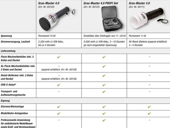 El NOCH Gras-Master 3.0 es una especie de hermano de la variante PROFI. Y como todos los hermanitos, tiene lo que se necesita. Más compacto, ágil y sin embargo poderoso; así es como se podría describir el Gras-Master 3.0. La pieza central es una batería de 9 V. Este también se usó en el Gras-Master y Gras-Master 2.0. Debido a las dimensiones más pequeñas de la batería, el dispositivo es más compacto y, por lo tanto, ligeramente más ligero que el Gras-Master 3.0 PROFI. Su potencia, sin embargo, es sólo marginalmente menor. Por lo tanto, es ideal para cada casa modelo de ferrocarril, diorama, paisaje y cualquier tarea rápida y espontánea. El dispositivo viene con tres accesorios de tamiz (multa, medio y grueso).