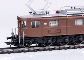 Locomotora eléctrica de la clase Ae 6/8 de Bern-Lötschberg-Simplon Railroad (BLS). Locomotora de la segunda producción. Esquema de pintura básica marrón oscuro con equipo de running negro. Versión como originalmente se veía con 2 pantógrafos y resistencias de freno en la sala de máquinas. Placas de cruce y luz de operación de línea incorrecta en los extremos de la locomotora. Imán de Signum Integra en locomotora End II. En cada uno de los lados de la locomotora hay 4 ventanas de la sala de máquinas y rejillas de ventilación tipo aleta. Carretera de locomotora número 207. La locomotora se ve como lo hizo al final de los años cuarenta/principio de los años cincuenta.