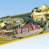 El diseño "Staufen" brilla con su hermoso paisaje que se asemeja a las Tierras Altas Centrales de Alemania y su espacioso restaurante de montaña. El bloque de la ciudad cerca de la estación, pegado a las vías, puede inspirar su fantasía con sus casas con entramado de madera. El diseño de la pista incorpora una estación impresionante, varios puentes grandes y 3 apartaderos de almacenamiento.