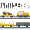 Independientemente del proyecto de construcción que se lleve a cabo en su modelo de ferrocarril: el tren de obra trae las herramientas necesarias. La robusta cargadora de ruedas Volvo se transporta en el vagón de costado bajo para realizar grandes excavaciones sin esfuerzo. Simplemente carga la arena excavada en la góndola. Lleva señales de advertencia y barreras en el carro de estaca para proteger su sitio de construcción. Este compuesto es tirado por la potente locomotora diésel DHG 300B con faros.