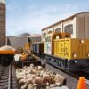 Modelo real: Locomotora diésel industrial Henschel serie DHG 300B. Un vagón de laterales bajos cargado, una góndola y un vagón de teleros pintados y rotulados para un tren de construcción.