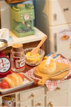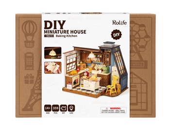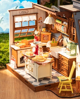 Rolife presenta la divertida y atractiva Cocina Horneada. Esta casa en miniatura DIY tiene todo lo necesario para satisfacer tus antojos de una acogedora escapada culinaria: detalles exquisitos, piezas interactivas y funcionales, y la calidez del hogar. Deleita tu vista con encantadores elementos esenciales de cocina como armarios empotrados de madera, una báscula antigua, una cafetera, relucientes encimeras blancas y una silla amarilla vintage. Disfruta de los amplios ventanales uno con un panel de vidrio inclinado de estilo europeo y el otro con un toldo con cortinas que permiten que esos deliciosos aromas se dispersen por el vecindario.