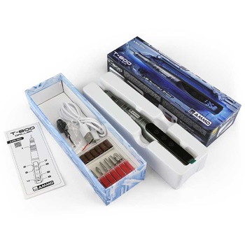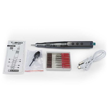 El minitaladro eléctrico T-800 de AMMO te permitirá realizar agujeros y trabajos de lijado y pulido de forma rápida y eficiente en tus maquetas gracias a su pequeño tamaño y peso. Su forma ergonómica de bolígrafo te permitirá sostenerlo cómodamente en tu mano durante períodos prolongados, y al no tener cable podrás usarlo sin restricciones en tu mesa de trabajo. Gracias al mandril universal incluido, podrás utilizar una gran variedad de brocas y fresas de forma cómoda gracias a su sistema de cambio rápido de accesorios. Incluye 5 fresas para tallado/grabado/lijado.