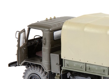 El camión soviético con tracción total GAZ-66 fue creado por ingenieros de la Planta de Automóviles Gorki para las necesidades del Ejército Soviético y la economía nacional. Los primeros camiones se ensamblaron en 1964. La gente apodó a este coche "Shishiga". El GAZ-66 puede transportar hasta 2 toneladas de carga en condiciones difíciles de la carretera. La velocidad máxima en autopista es de 90 km/h. Se logra una buena capacidad a campo traviesa debido a la carga uniforme en los ejes, la presión ajustable de los neumáticos y el uso de diferenciales de levas en los ejes delantero y trasero, y la alta distancia al suelo. Durante su funcionamiento, el camión se modernizó en repetidas ocasiones. La modificación GAZ-66-11 entró en producción en 1985. El coche recibió un sistema central de regulación de la presión de los neumáticos y un moderno equipo de iluminación. En 1993, se instaló una nueva plataforma de carga universal sin pasos de rueda, con mayores dimensiones internas. Esta es la versión de "Shishiga" representada en el modelo.