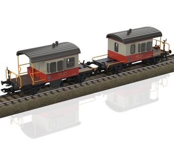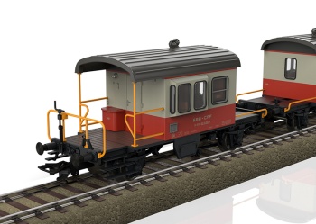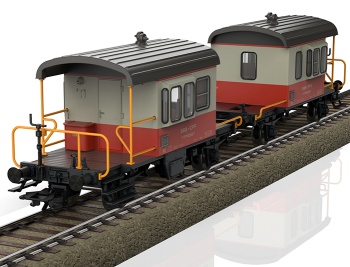 Dos antiguos vagones de acompañamiento de servicio Sputnik diseño DB de los Ferrocarriles Federales Suizos (SBB/CFF/FFS). Coloración básica gris/anarriente de sangre en uso como carro de cúpula del Swiss Express. Estado operativo desde 1975.